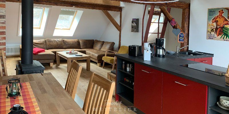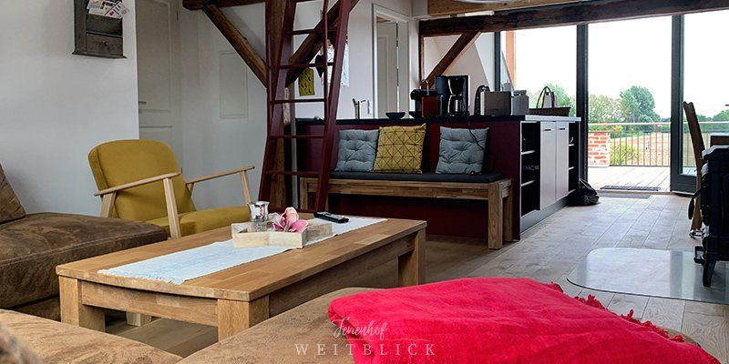Die Ferienwohnung "Zum Feldherren" befindet sich auf der linken Seite des Gebäudes, vom Feld aus gesehen. Sie ist erreichbar über die große Ost-Terrasse (35 m²), wo Sie Ihr Frühstück oder Abendbrot mit Weitblick aufs Land und zur Bockwindmühle genießen können.